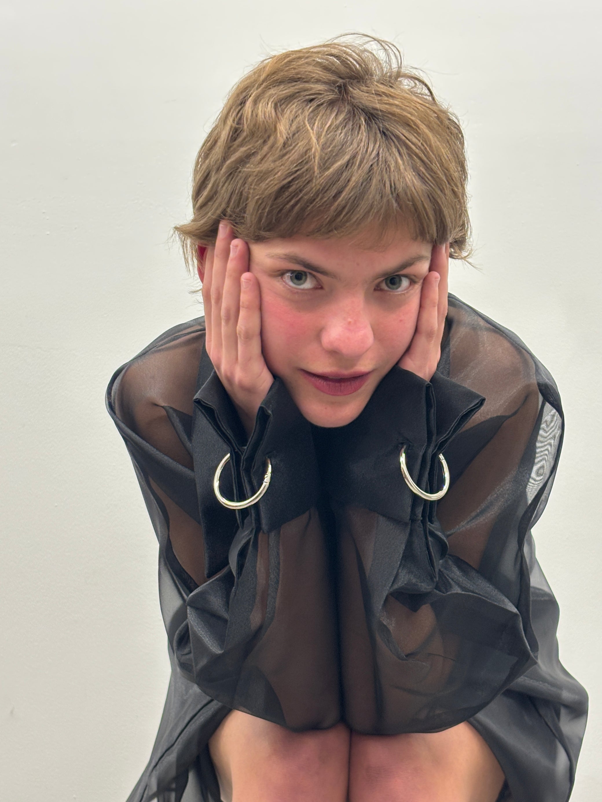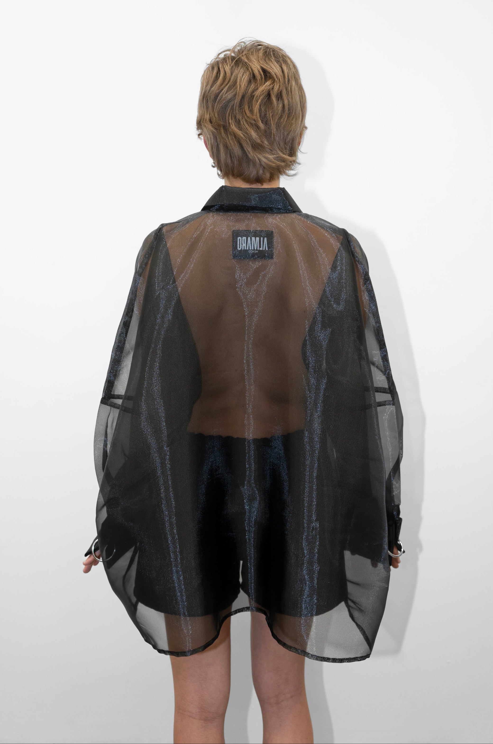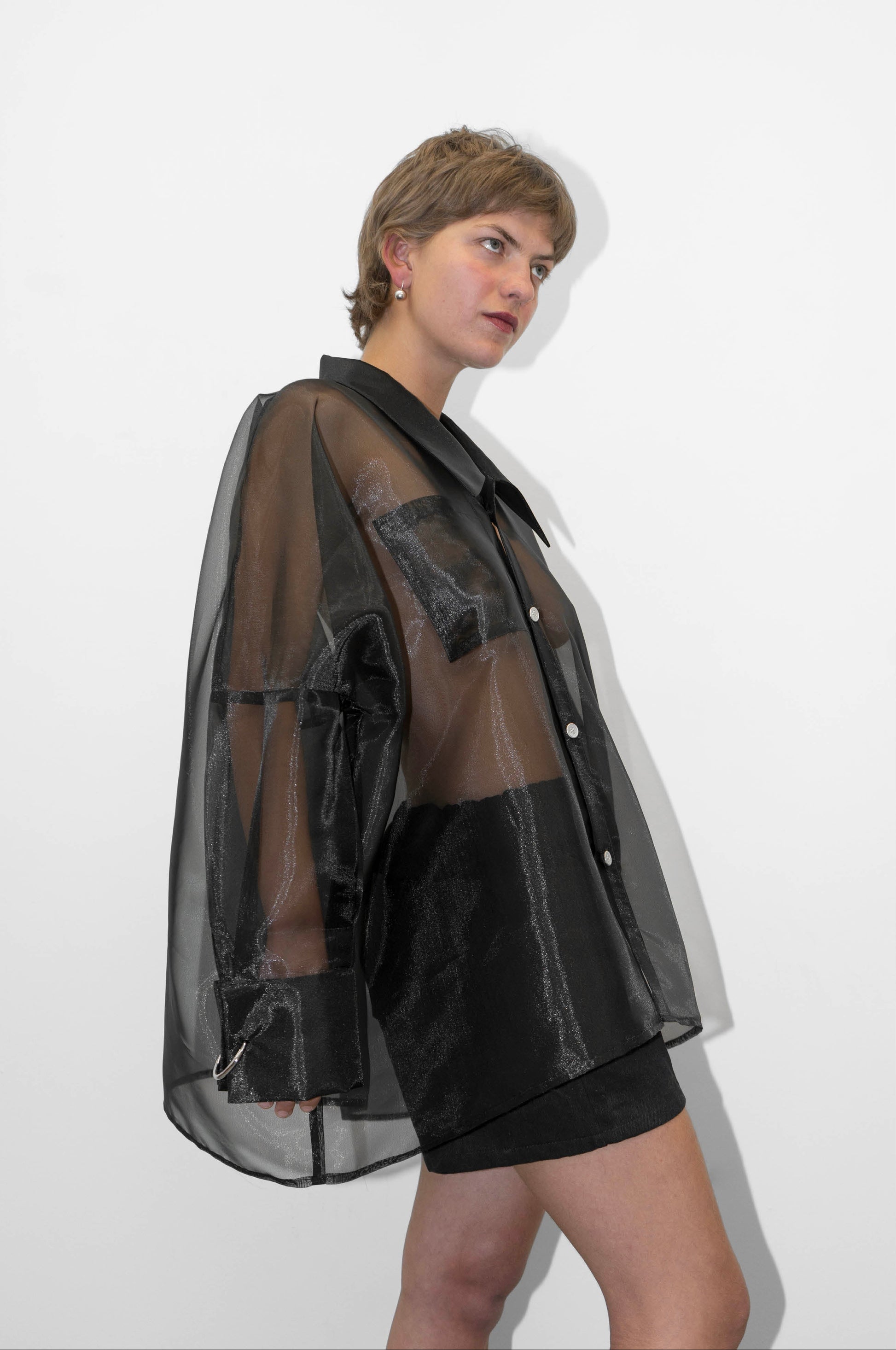 Almost like wearing a piece of art, this Joker Shirt in organza is transparent, airy, and oversized in all the right ways. Big collar, front pocket, and metal-ring cufflinks give it structure and playfulness, while the sheer fabric turns heads and starts conversations. Made from deadstock organza, each shirt is limited and extraordinary.