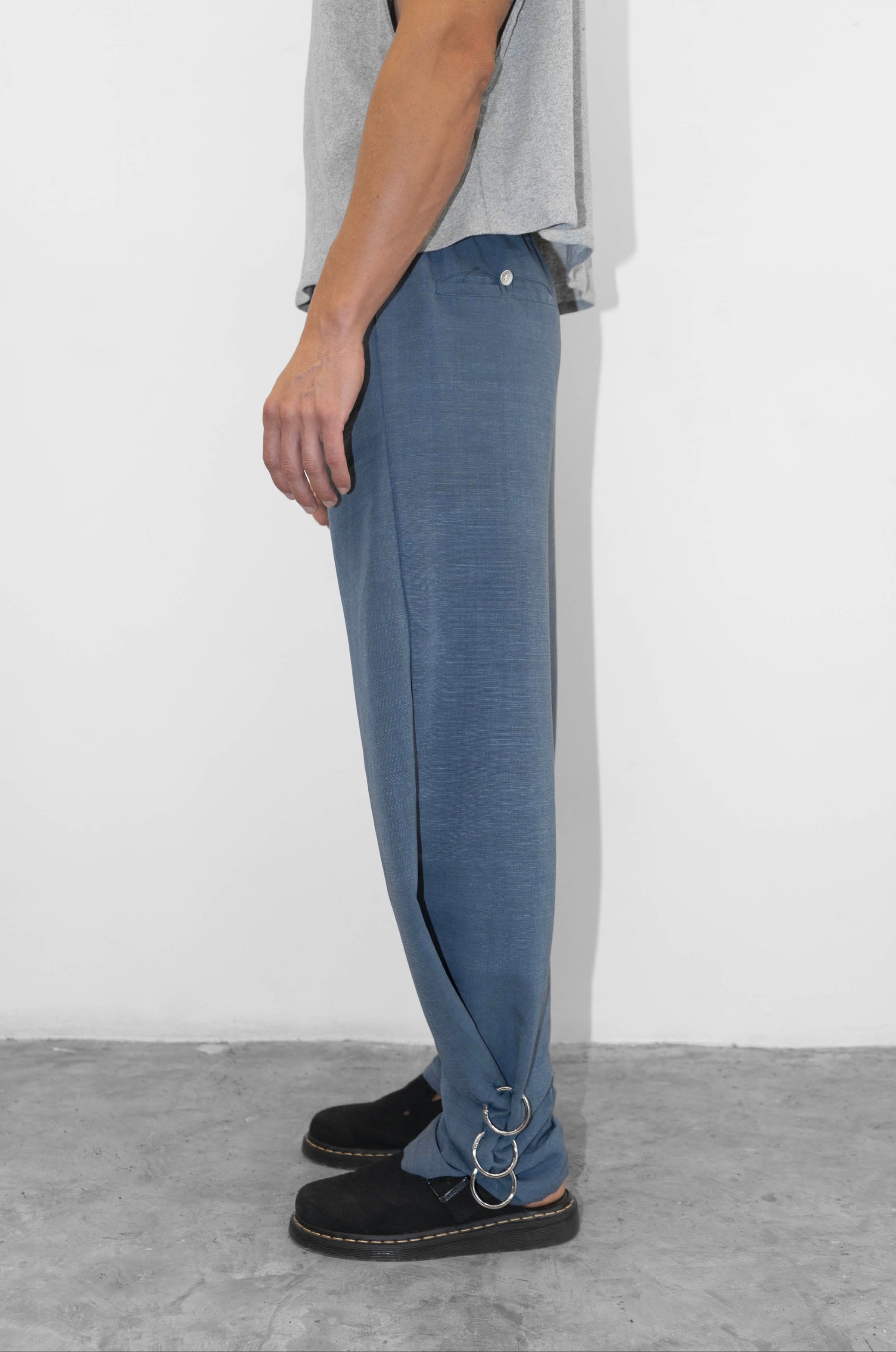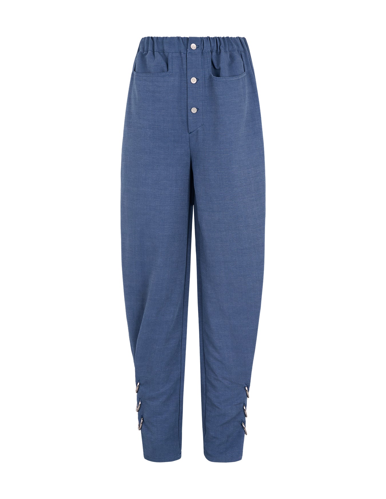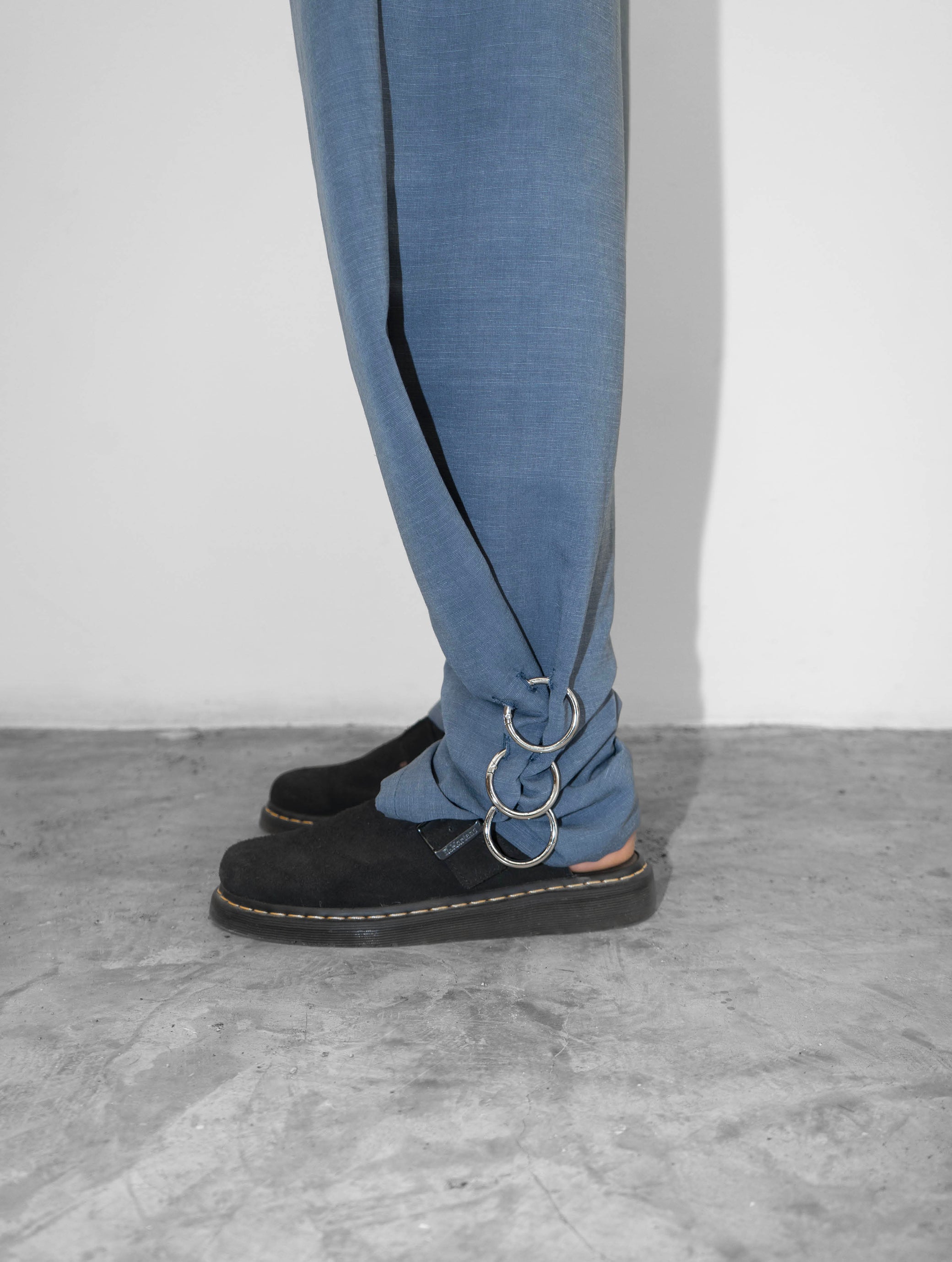 Straight-leg pants with an elasticated waistband, three front buttons, and detachable metal rings at the ankles—so you can switch between minimal and statement in seconds. Made from super soft deadstock cotton, each pair is limited, so once this fabric runs out, it’s gone. The silhouette stays sleek and versatile, while the rings let you play with shape and volume whenever you like.