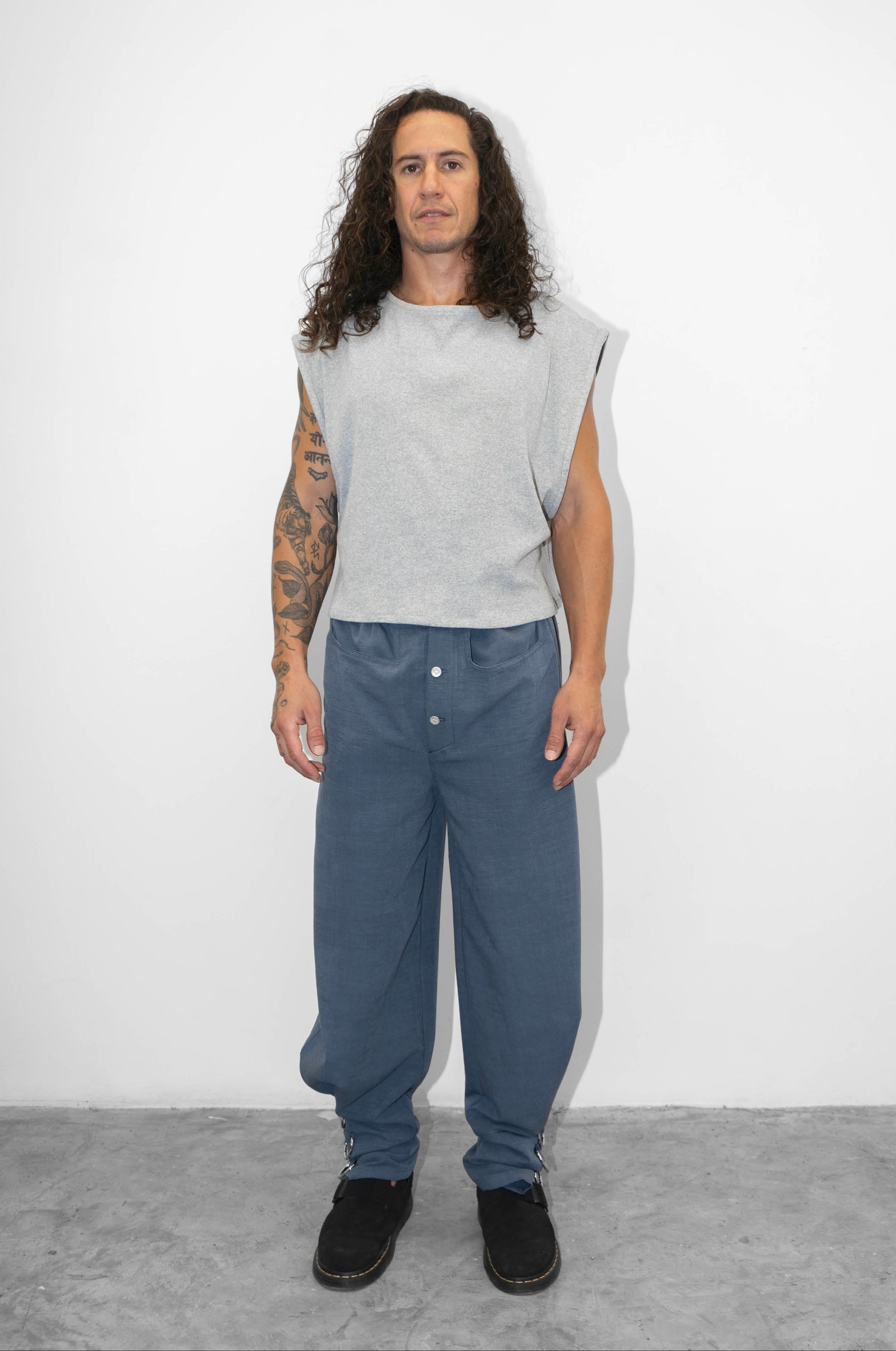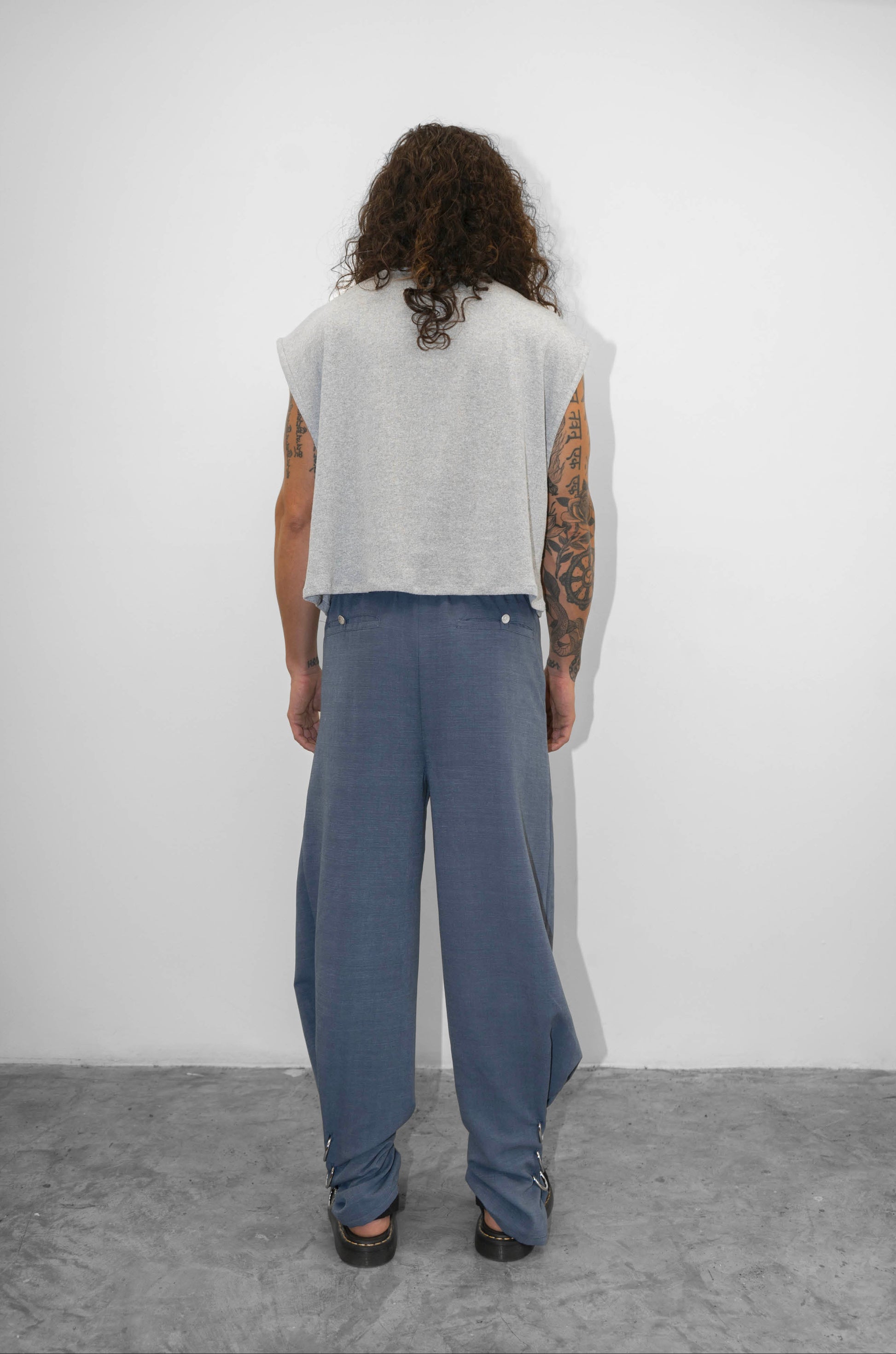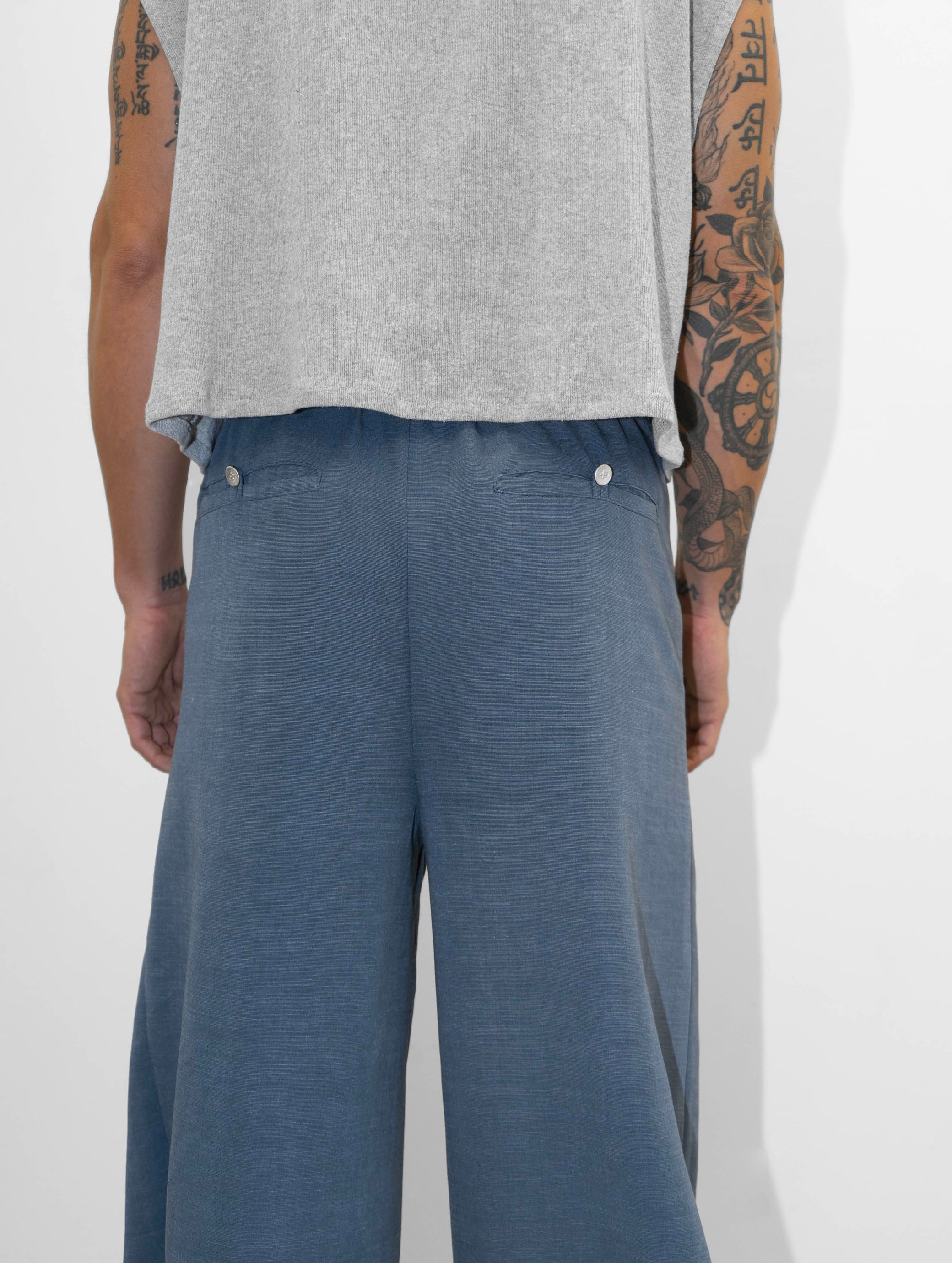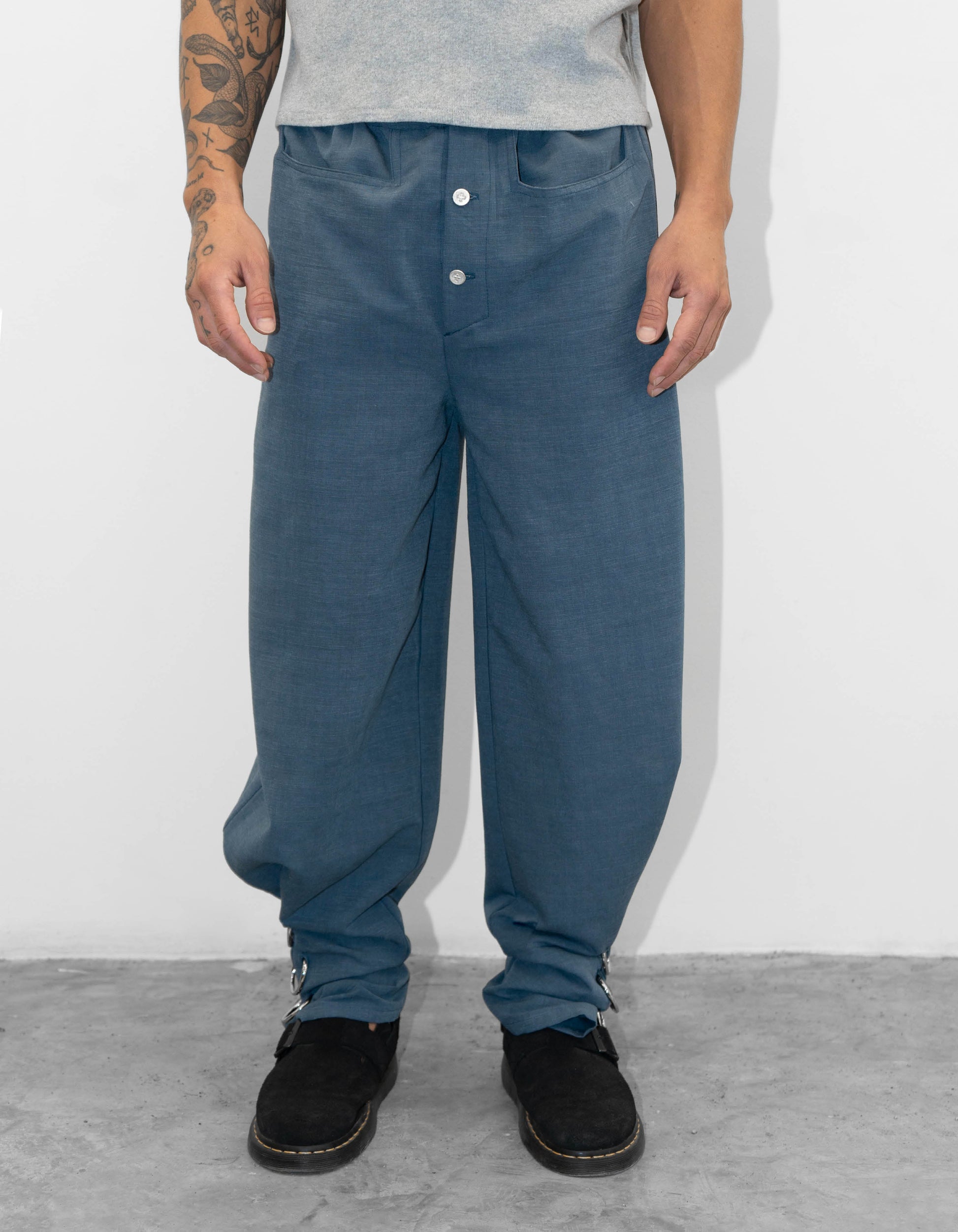 Straight-leg pants with an elasticated waistband, three front buttons, and detachable metal rings at the ankles—so you can switch between minimal and statement in seconds. Made from super soft deadstock cotton, each pair is limited, so once this fabric runs out, it’s gone. The silhouette stays sleek and versatile, while the rings let you play with shape and volume whenever you like.