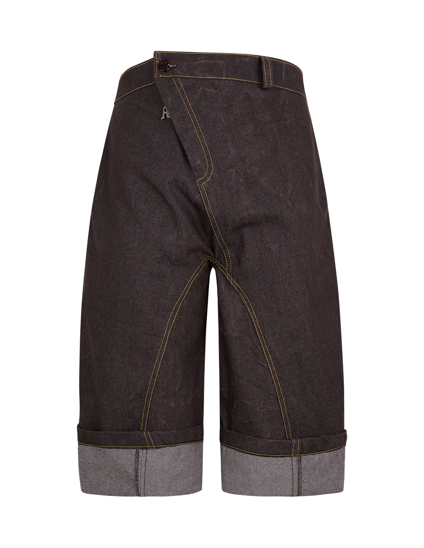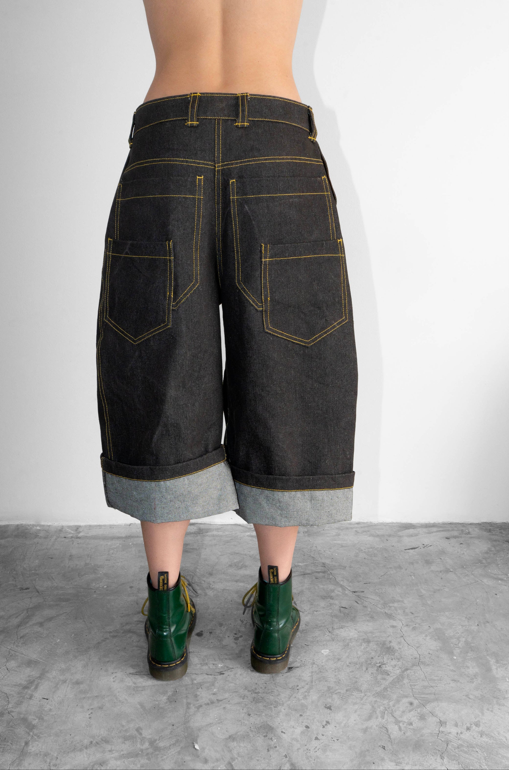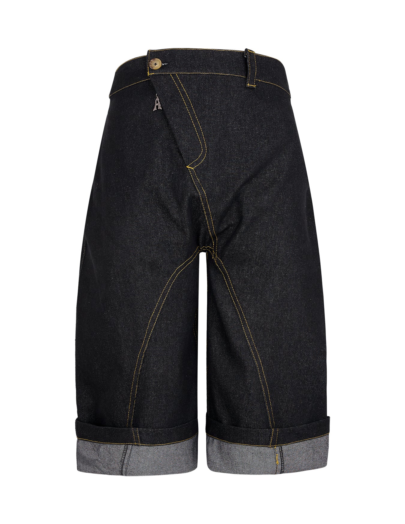 Long denim shorts that do all the talking without trying too hard. The front features an asymmetrical crossed zipper for an unexpected edge, while the back is all about clever layering: four pockets that play with depth and dimension, perfect for stashing your essentials—or just showing off. Side pockets add even more utility, and the unique cut at the crotch gives them a fit and movement you won’t find anywhere else.
