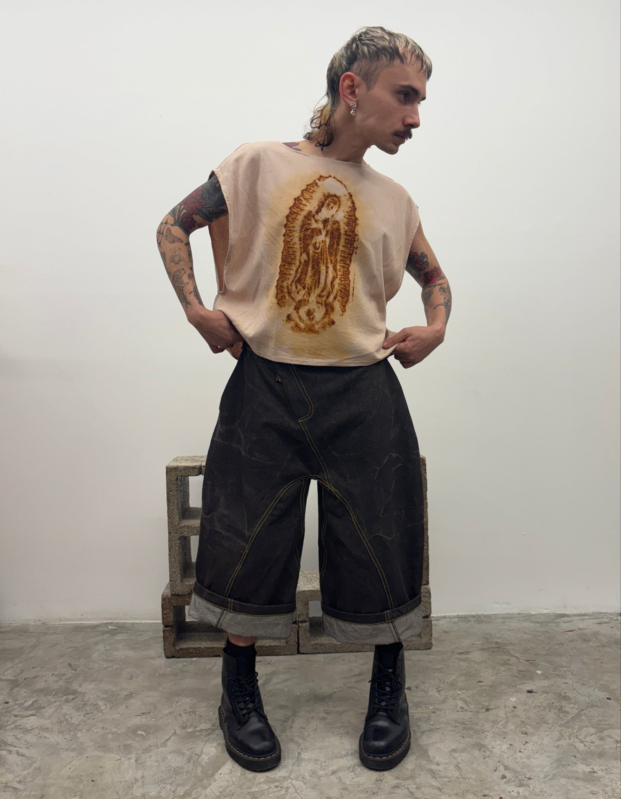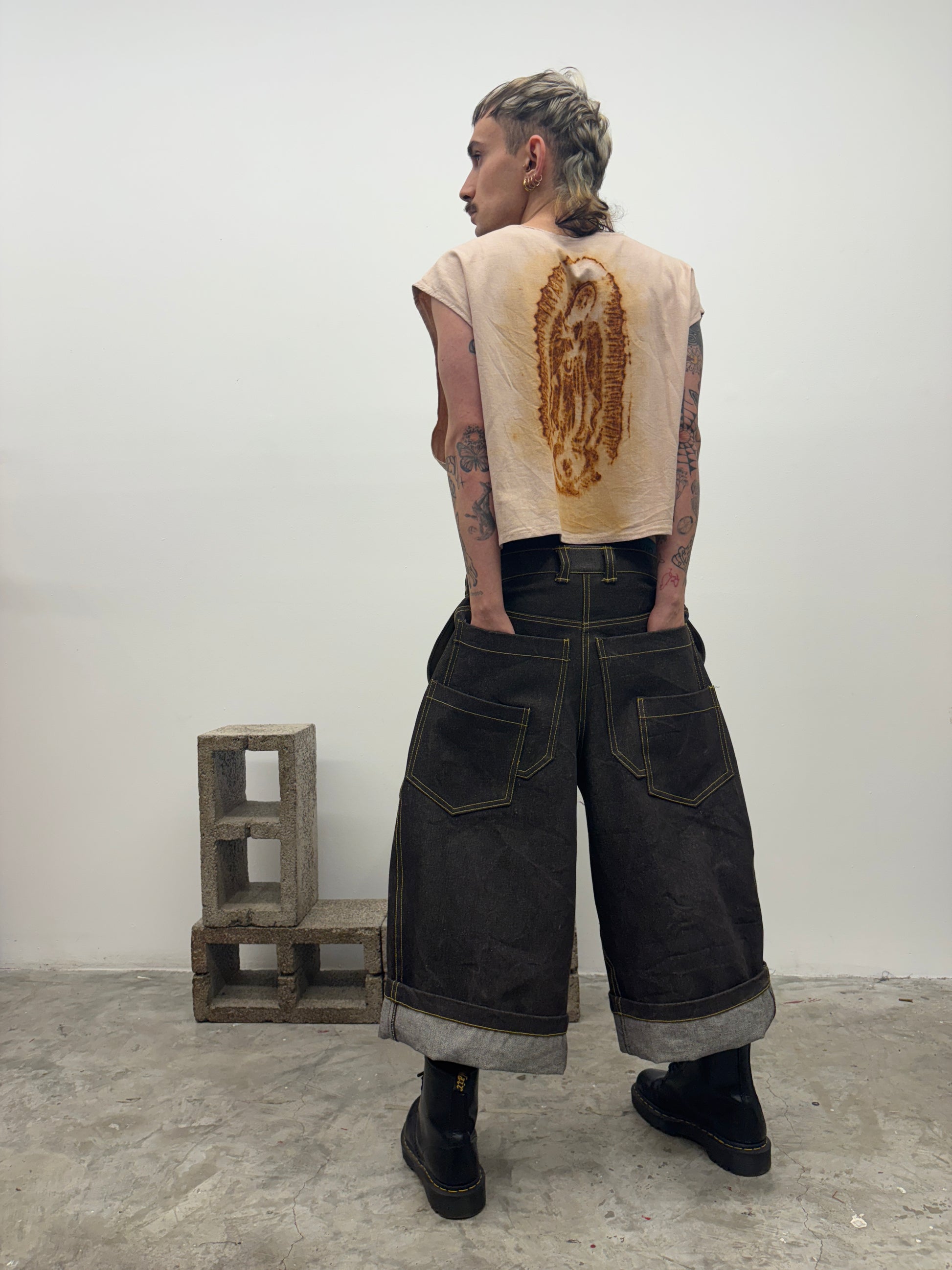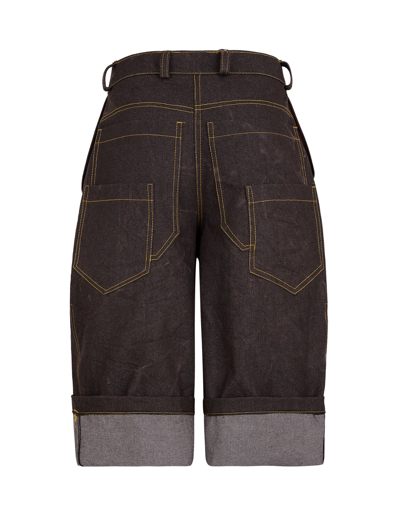 Long denim shorts that do all the talking without trying too hard. The front features an asymmetrical crossed zipper for an unexpected edge, while the back is all about clever layering: four pockets that play with depth and dimension, perfect for stashing your essentials—or just showing off. Side pockets add even more utility, and the unique cut at the crotch gives them a fit and movement you won’t find anywhere else.