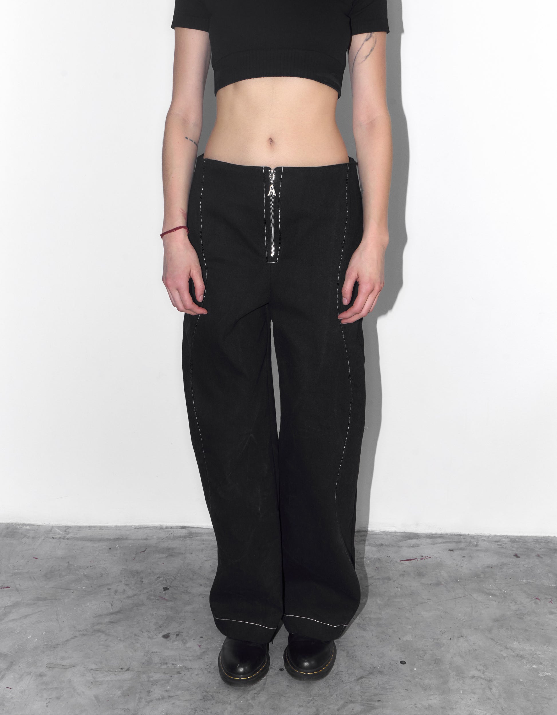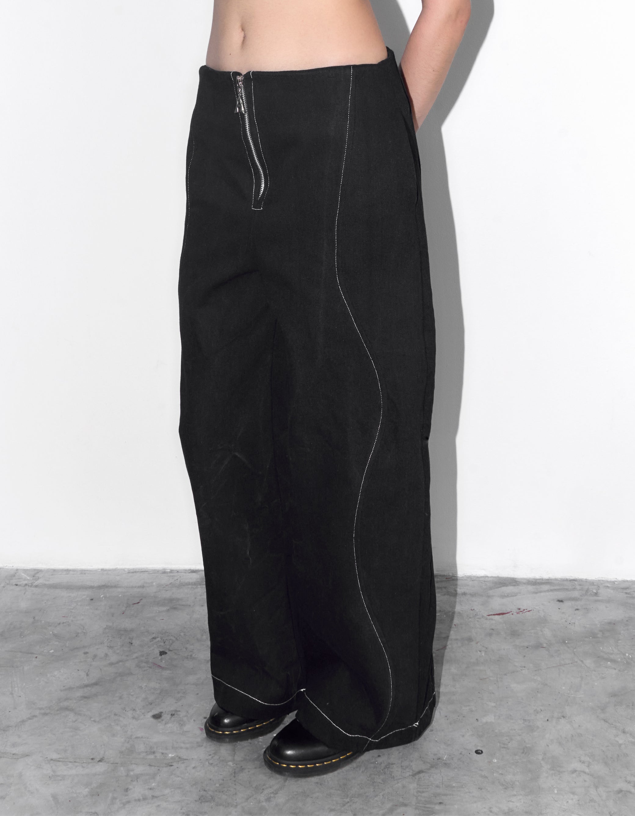 Straight-leg denim pants with a front zip closure, wavy-shaped seams along the sides, and side pockets—classic denim reimagined with a playful twist. The silhouette is versatile: size down for a snug waist or size up for a relaxed, low-rise fit.
