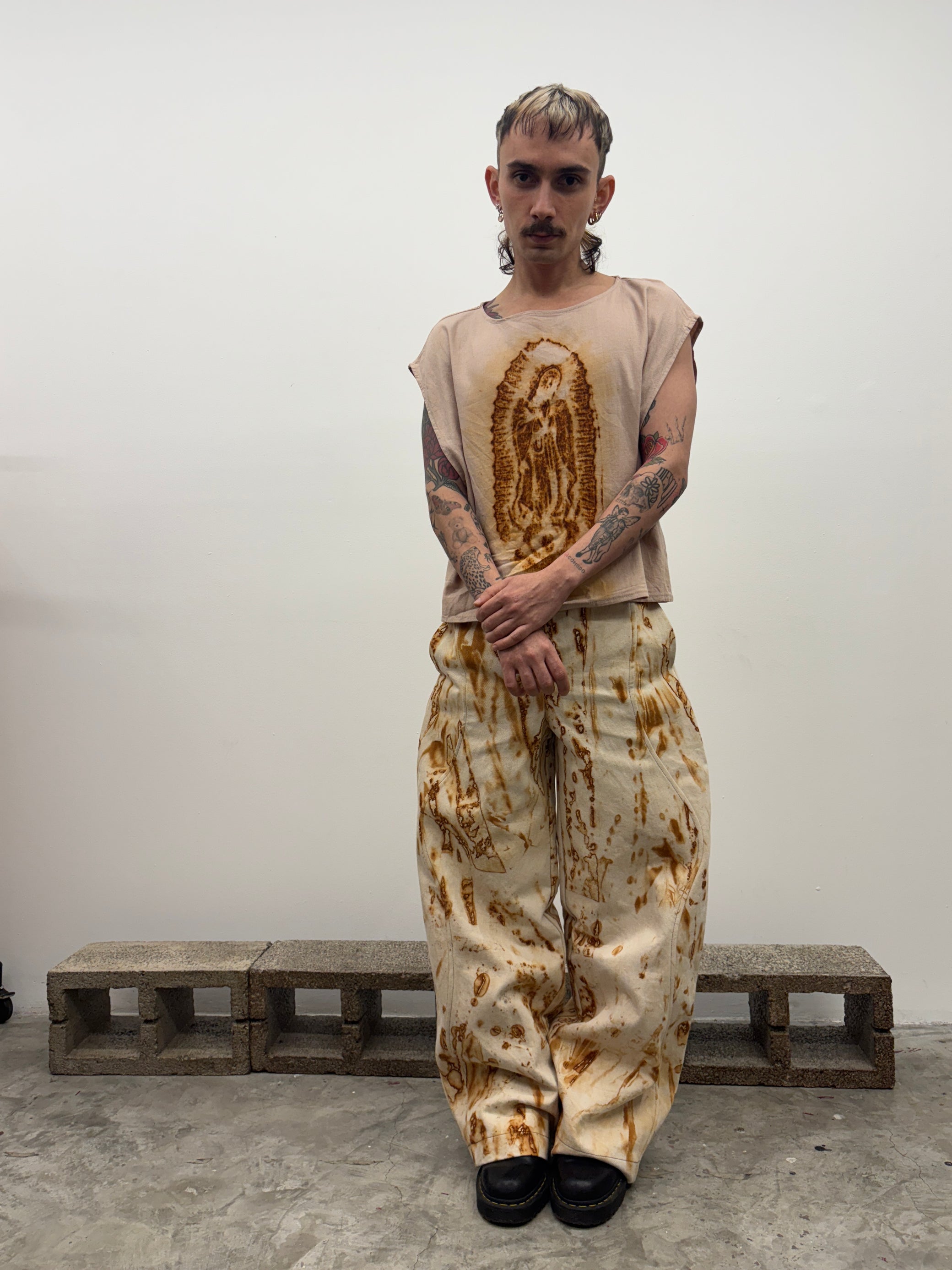 Straight-leg denim pants with a front zip closure, wavy-shaped seams along the sides, and practical side pockets—these pants turn a classic silhouette into something unexpected. Made from hand rust-dyed denim, each pair is unique, with subtle variations in color and texture. For fit, size down for a snug waist or size up for a relaxed, low-rise vibe.