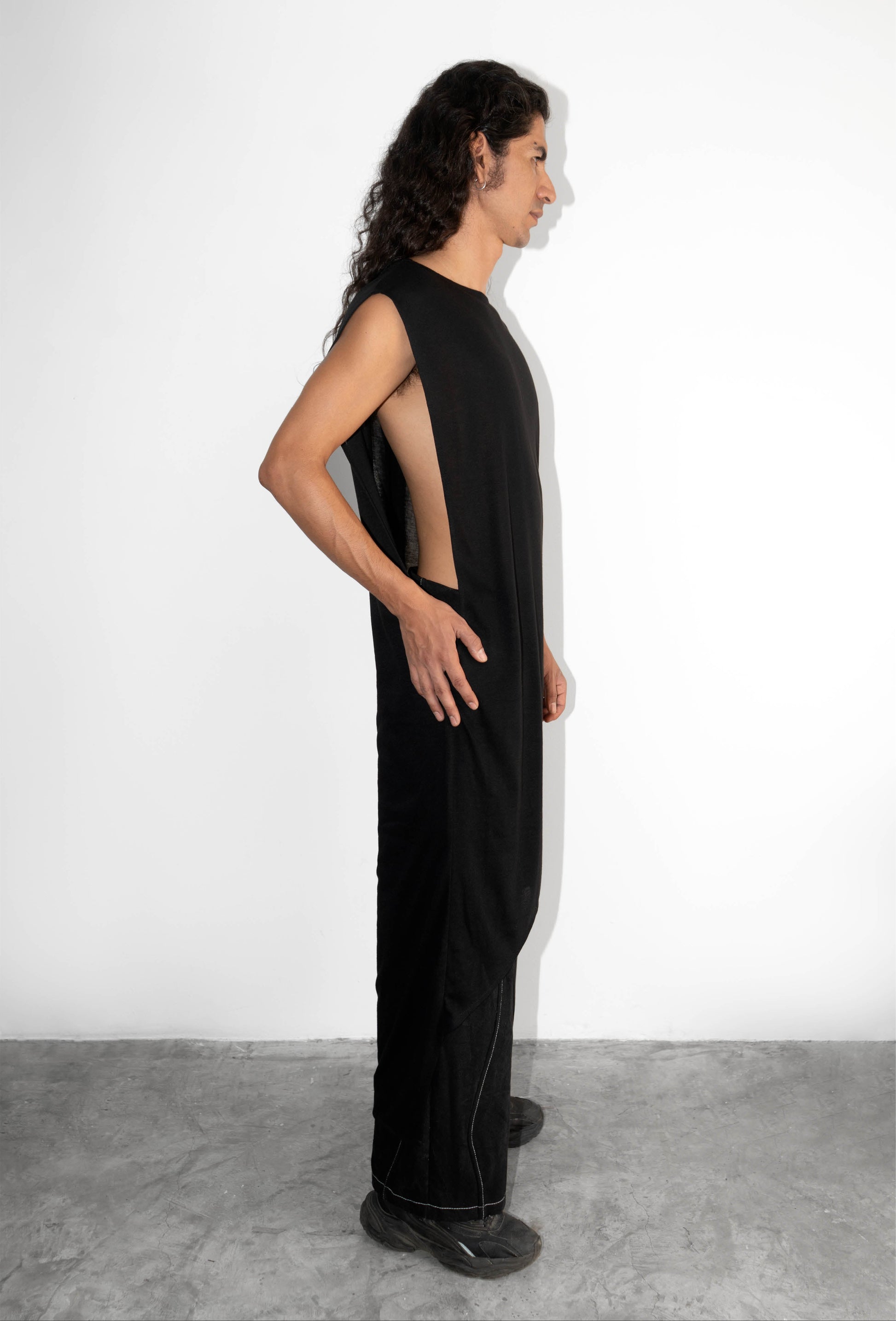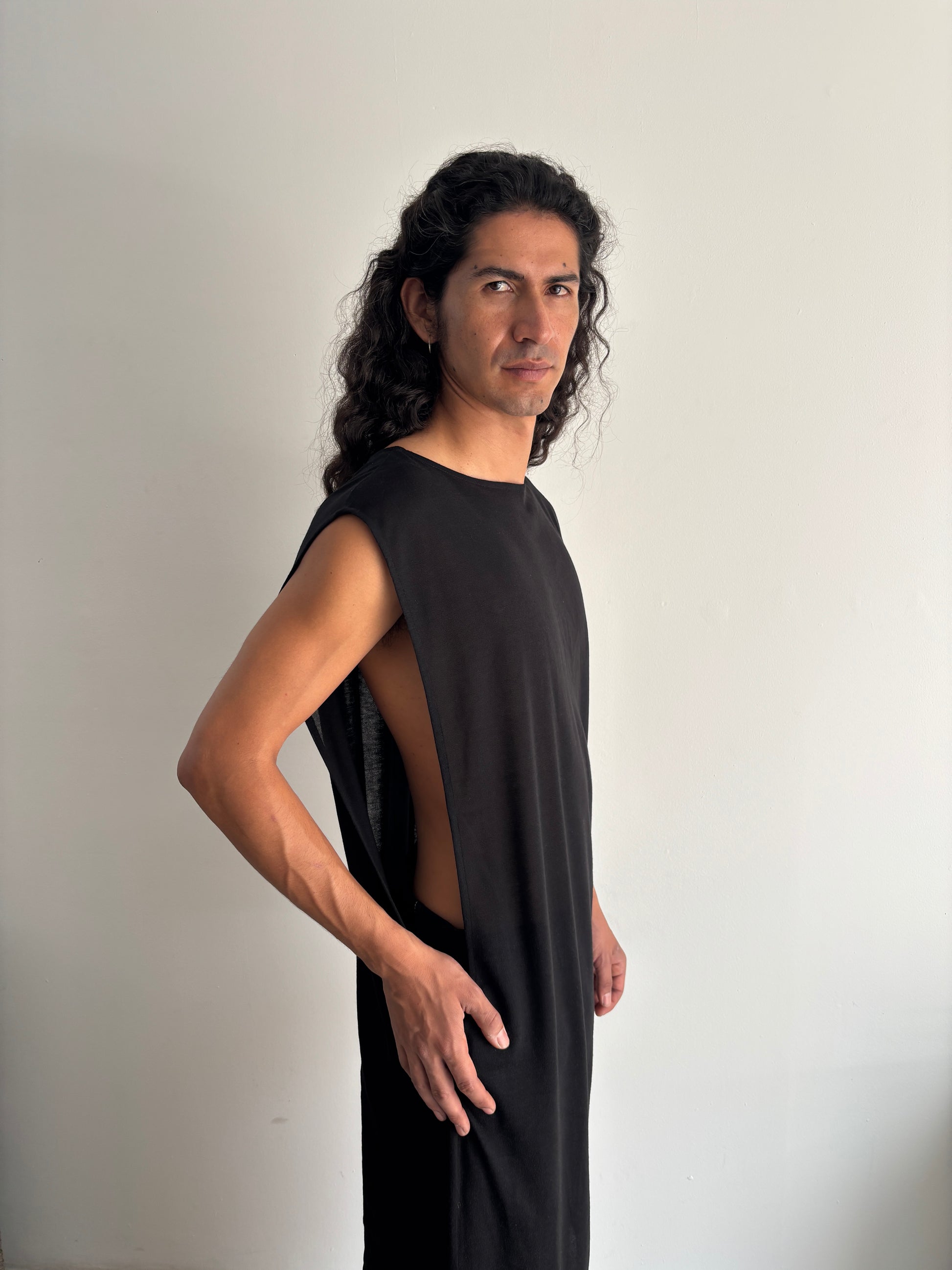 Soft, oversized, and effortlessly relaxed, this piece falls to the thighs on the sides and features an asymmetrical cut from front to back. Made from soft and comfortable deadstock cotton, it’s easy to layer or wear on its own, offering both comfort and playful movement.