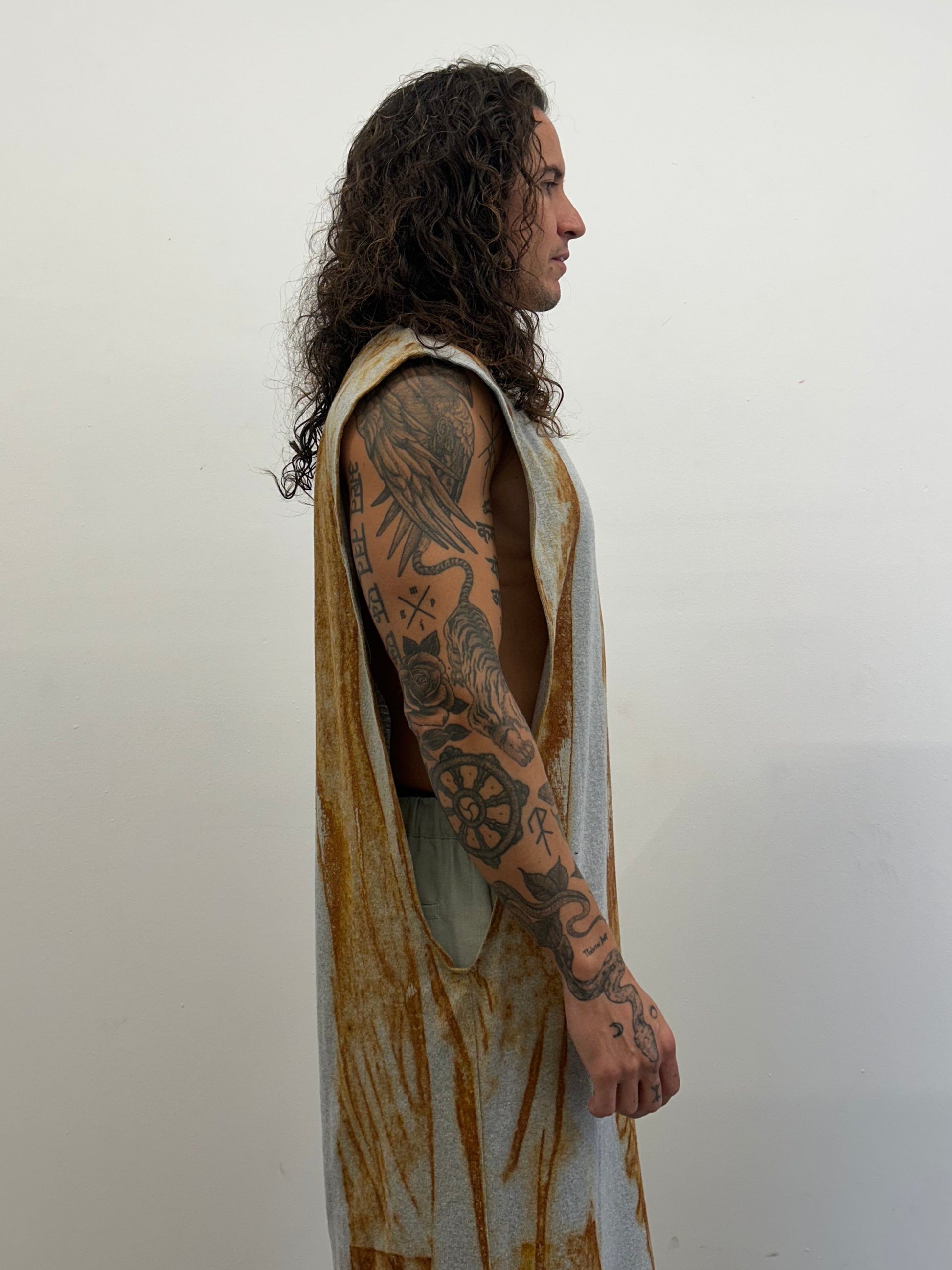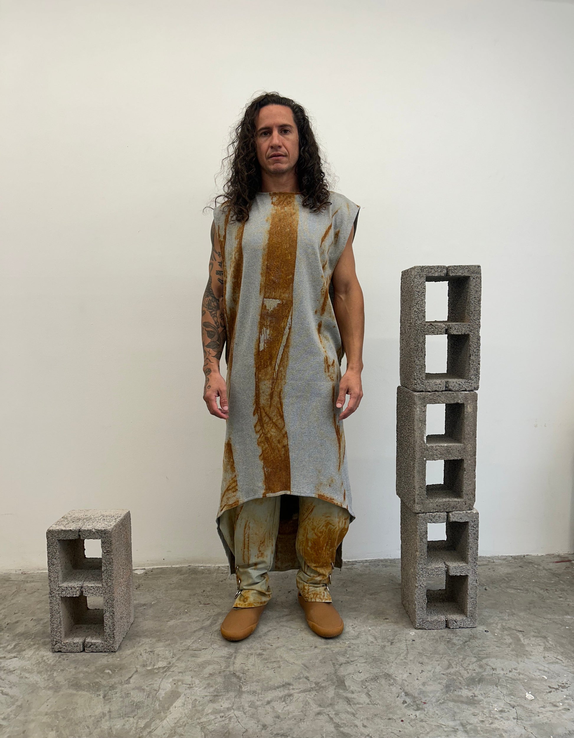 Oversized and relaxed, this piece falls to the thighs on the sides with an asymmetrical cut from front to back. Made from deadstock cotton and hand-dyed in rust with bold stripes, each tunica is completely unique—no two pieces are ever the same. The combination of texture, color, and shape gives it a playful edge while staying effortless to wear.