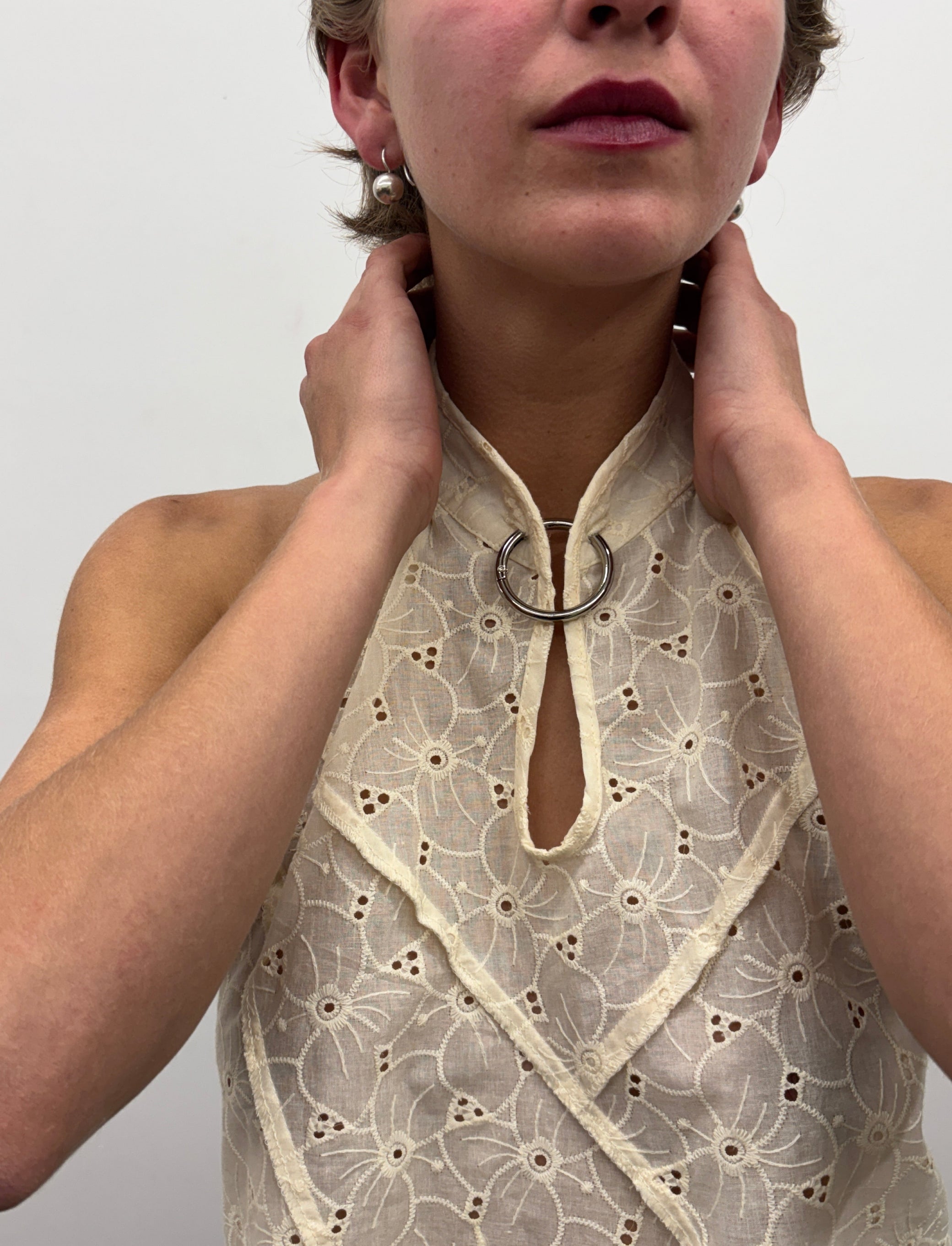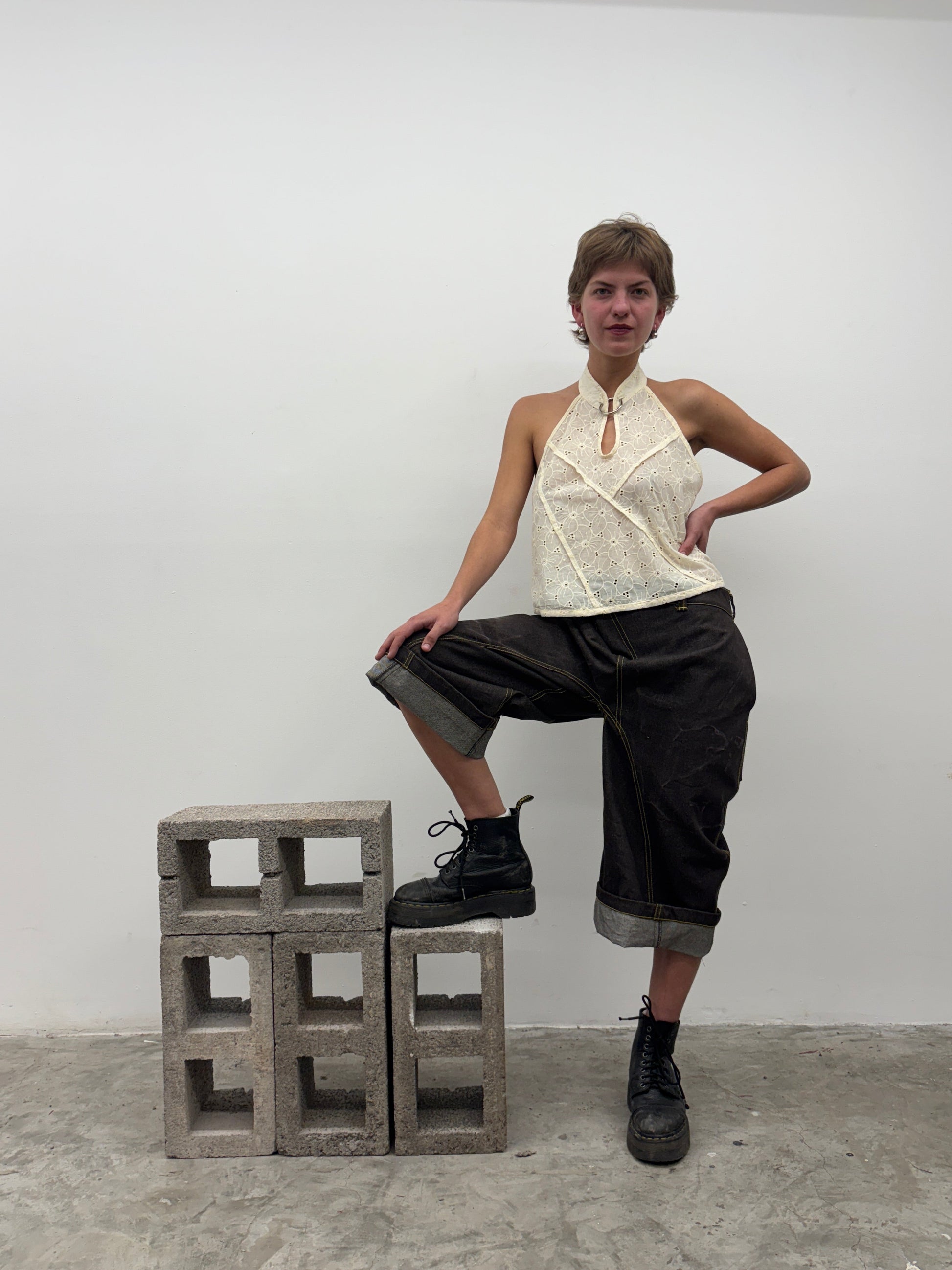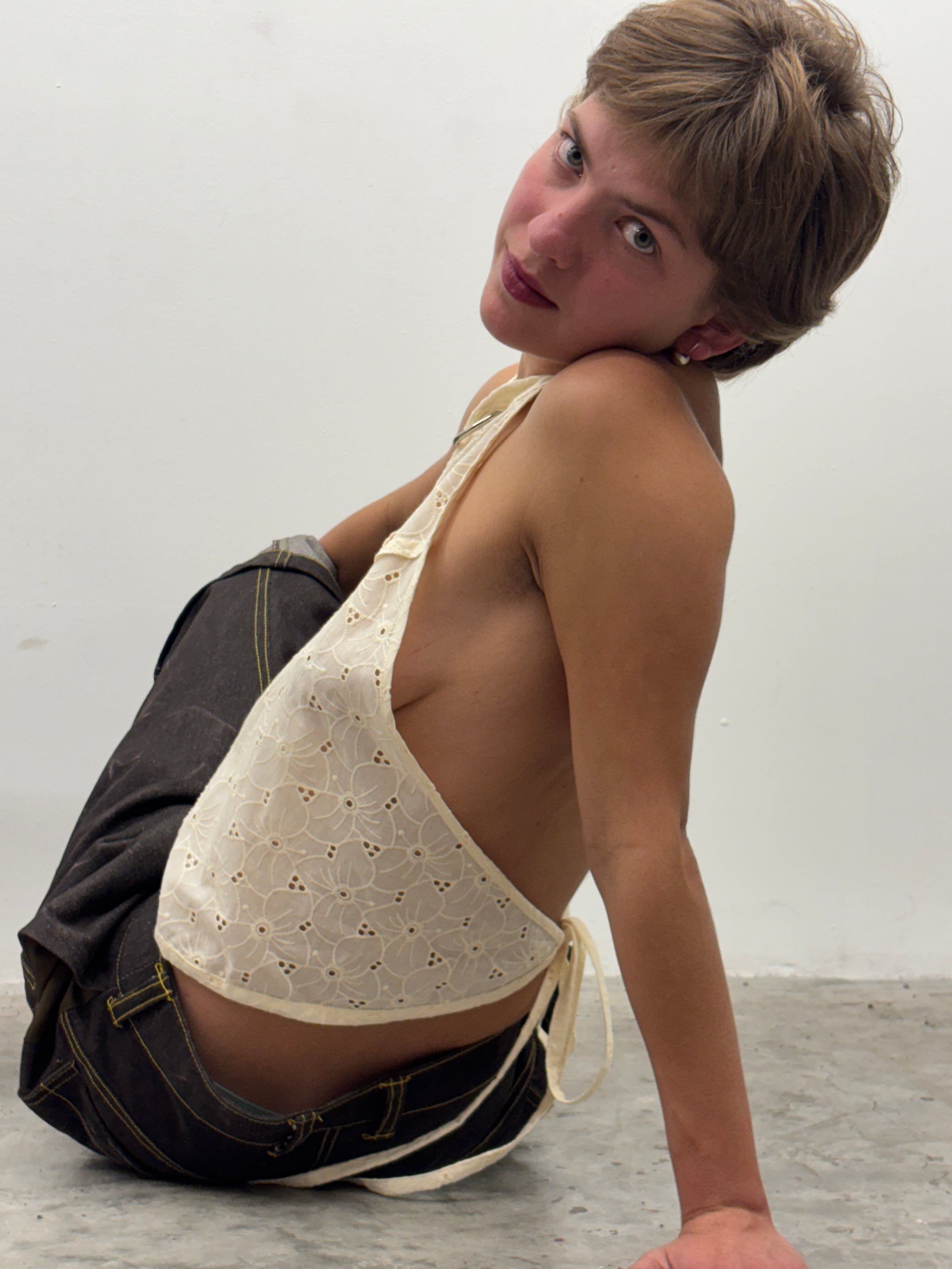 Asymmetrical and light, the Triangulo Top features strings to tie it at the back or wrap it all the way around for a fresh silhouette. The neckline includes a detachable metal ring, while the open back keeps it playful and airy. Made from deadstock thin cotton, each piece is limited and one-of-a-kind.