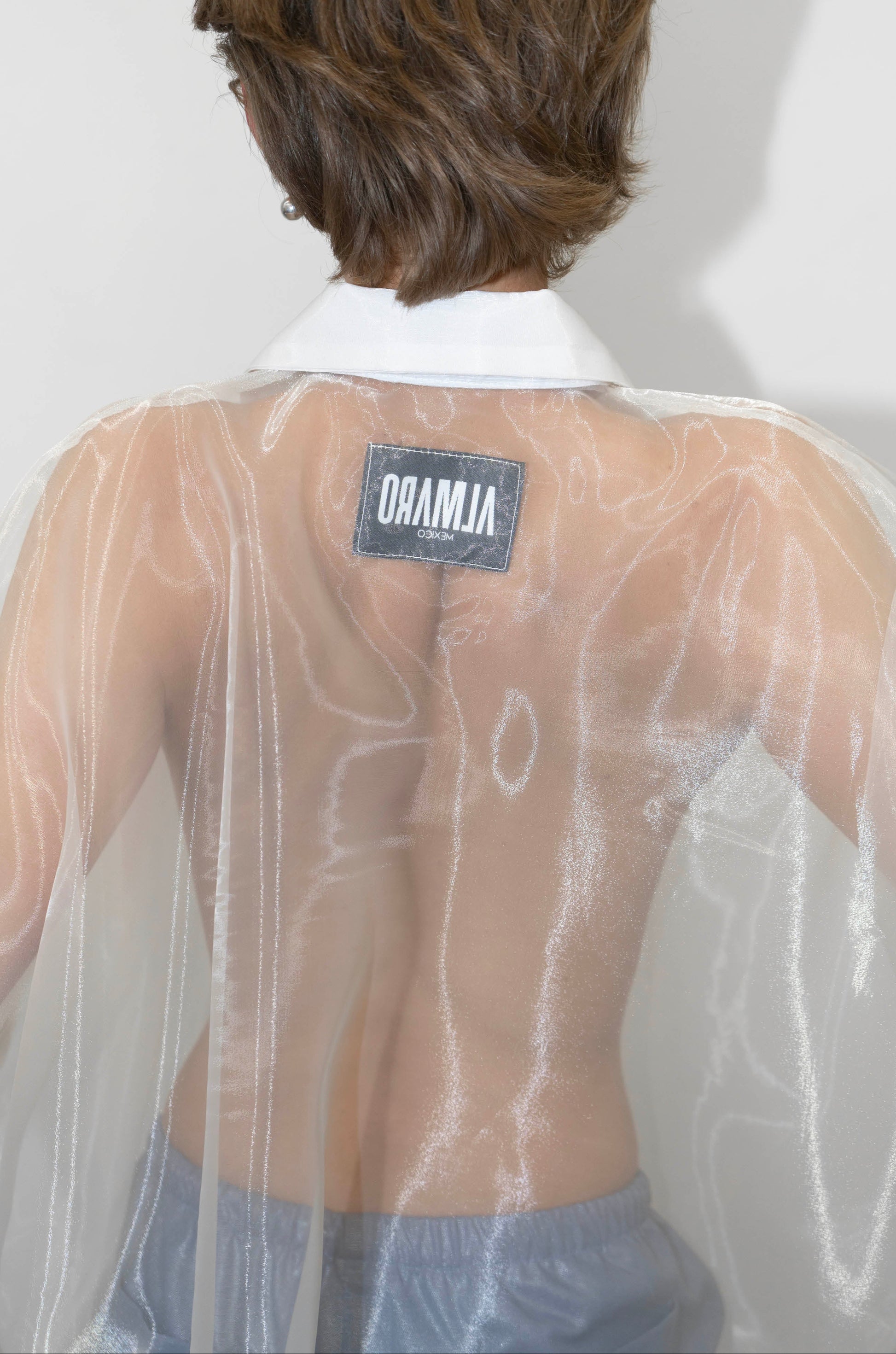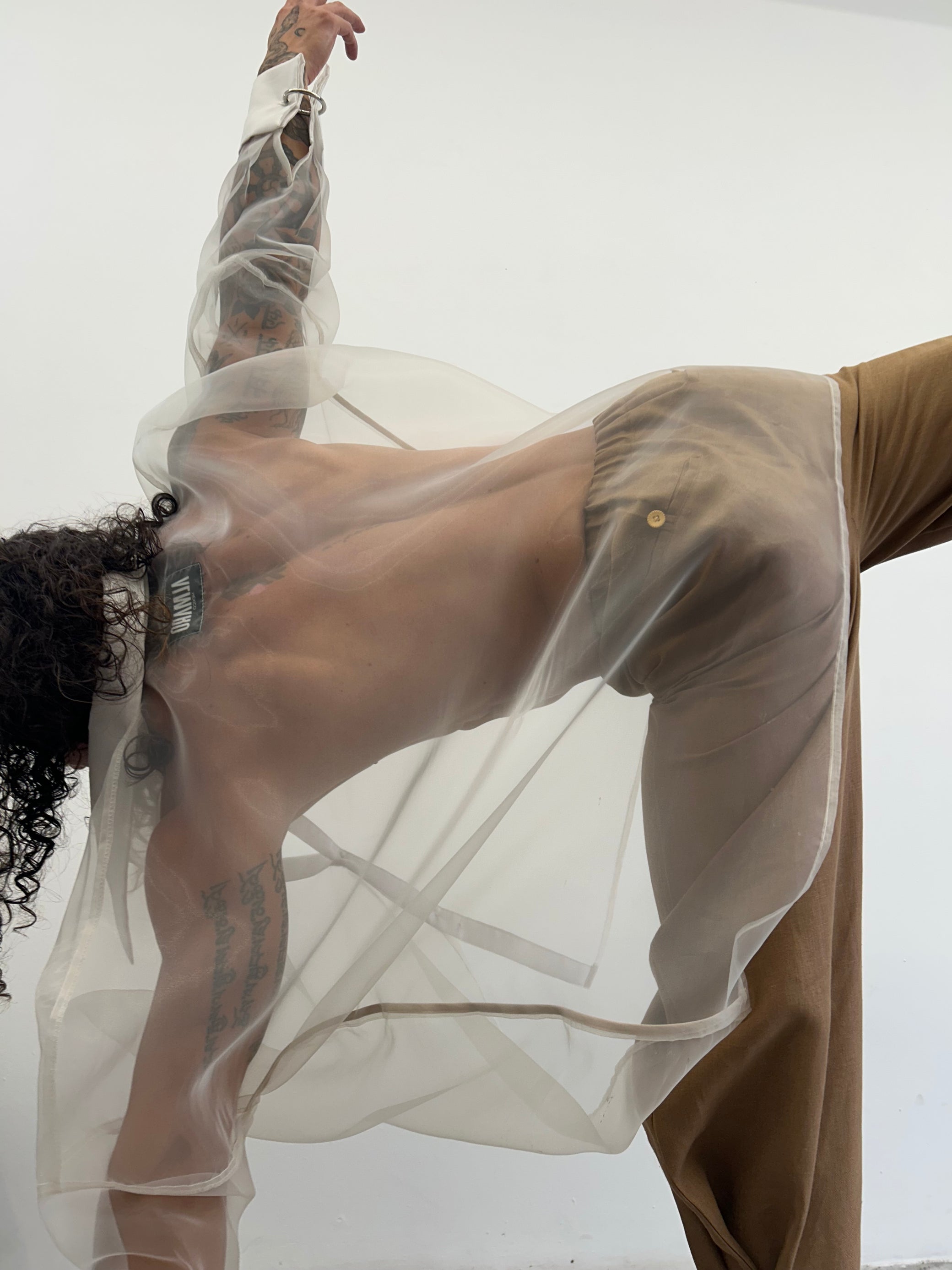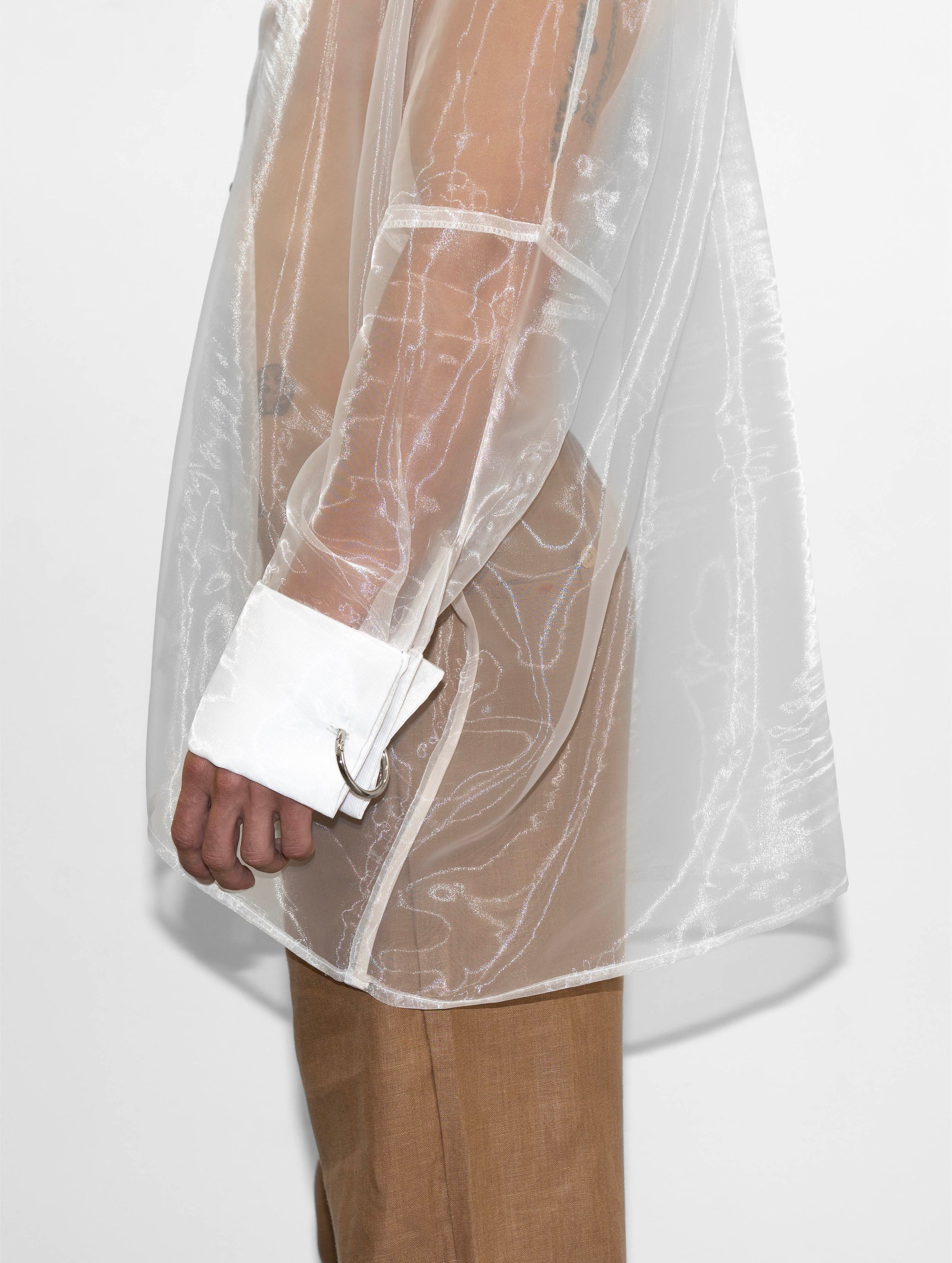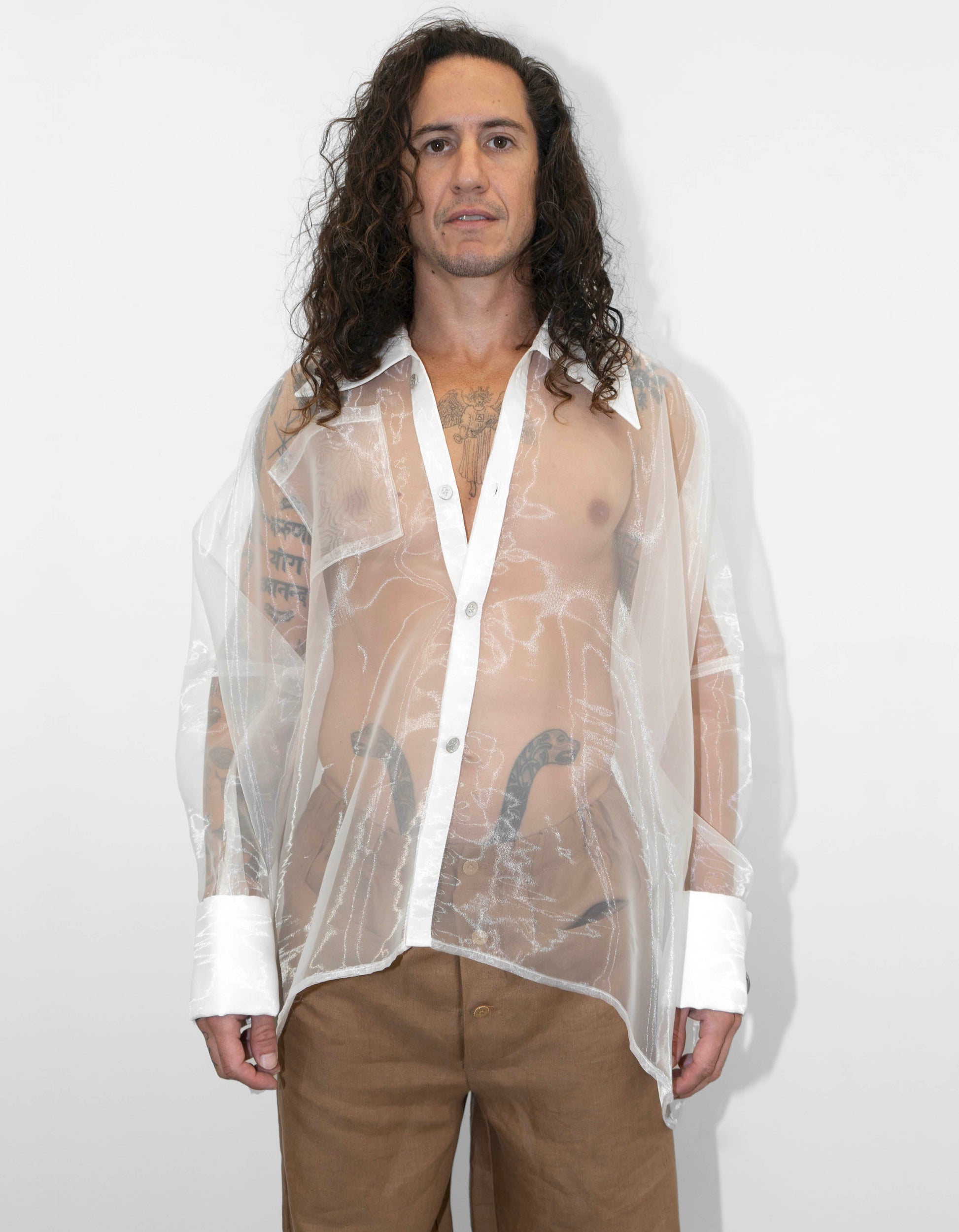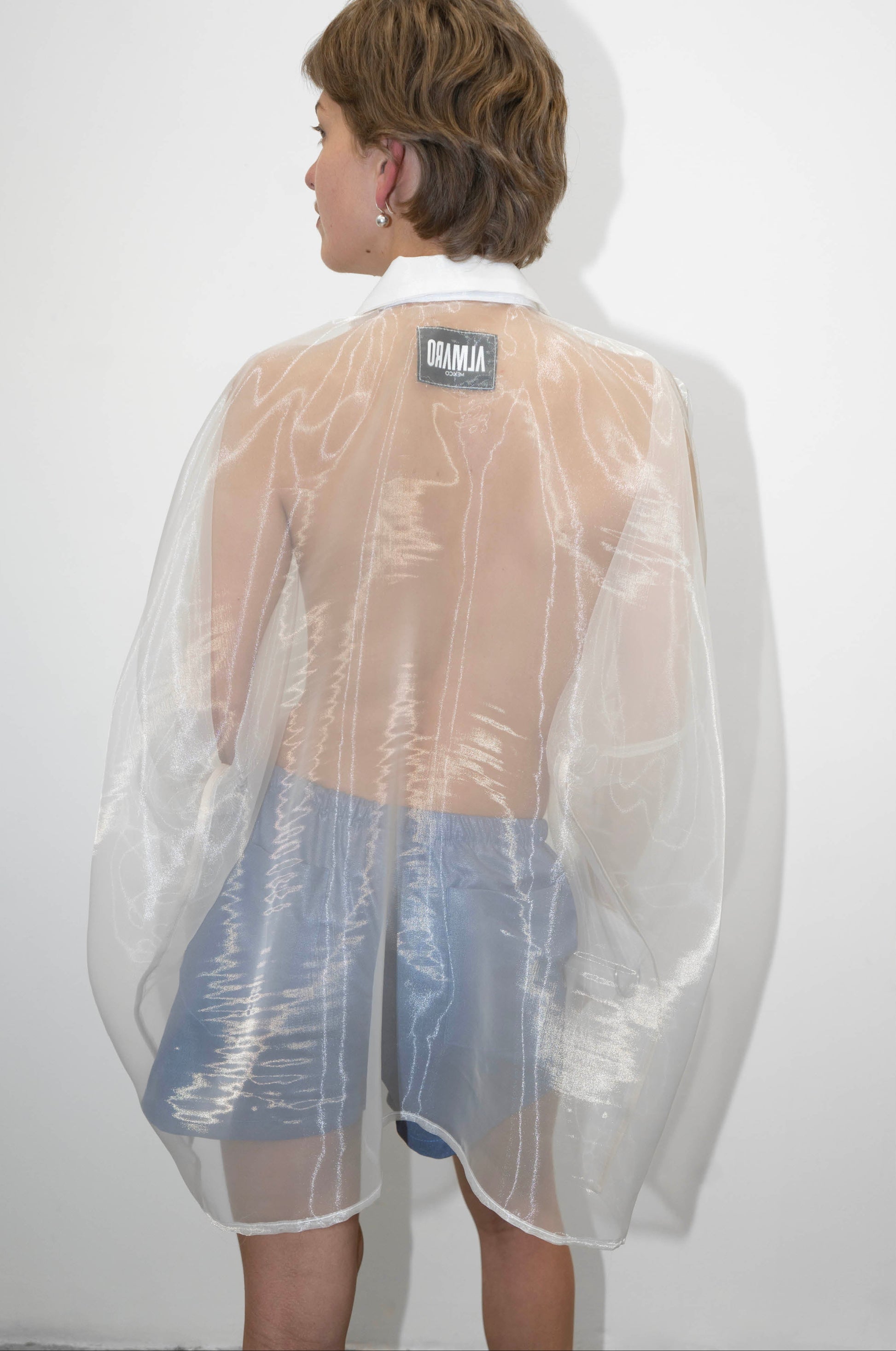 Almost like wearing a piece of art, this Joker Shirt in organza is transparent, airy, and oversized in all the right ways. Big collar, front pocket, and metal-ring cufflinks give it structure and playfulness, while the sheer fabric turns heads and starts conversations. Made from deadstock organza, each shirt is limited and extraordinary.